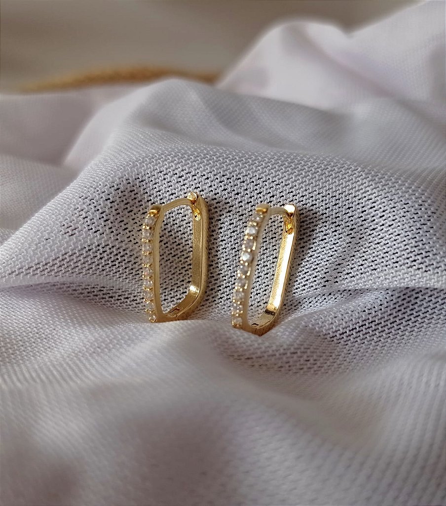 Brinco modelo argola em formato retangular, adornado com fileira de zircônias de alto brilho, banhado em ouro 18k, com acabamento sofisticado e antialérgico, é uma peça elegante que une modernidade e sofisticação, ideal para produções casuais e especiais.