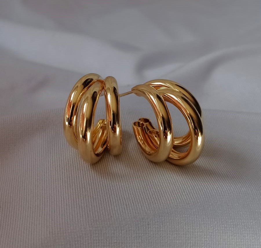 Brinco argola em camadas, com design moderno e elegante, banhado em ouro 18k com acabamento liso e antialérgico, peça versátil que agrega sofisticação a qualquer estilo ou ocasião. Seu formato em sobreposição proporciona efeito volumoso e refinado, garantindo presença marcante com elegância discreta.