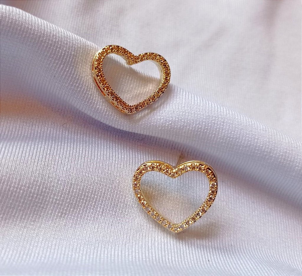Brincos modelo coração vazado, cravejado com zircônia branca, banhado a ouro 18k, com banho antialérgico e garantia de 6 meses que cobre excluisivamente o desgaste natural da folheação.