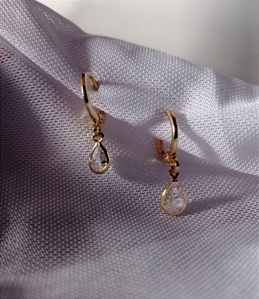 Brinco modelo argola com delicado pingente de zircônia em formato de gota, que proporciona brilho sofisticado e elegante, banhado em ouro 18k, com acabamento refinado e antialérgico, é uma peça versátil que valoriza produções casuais e ocasiões especiais.