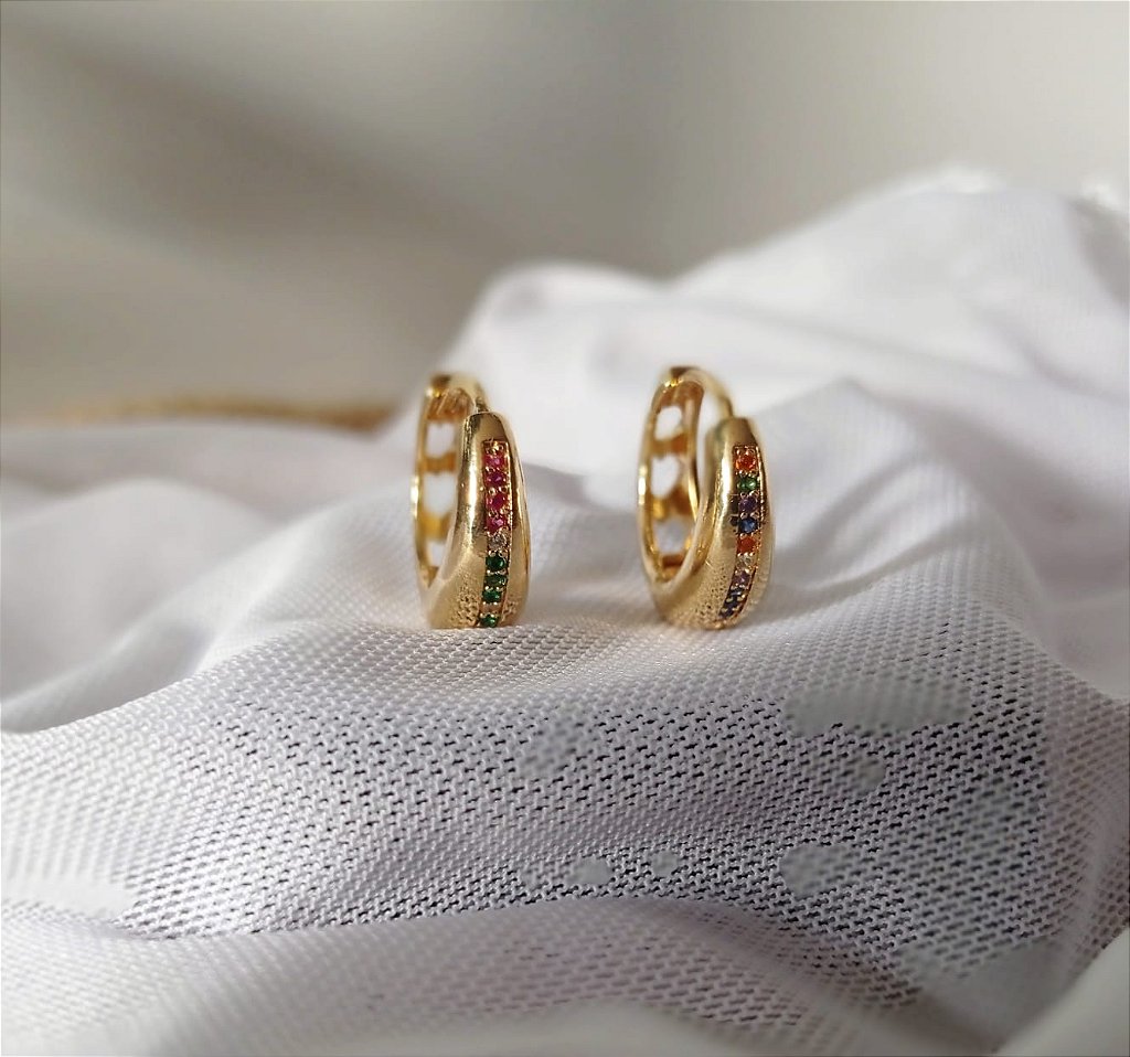 Brinco modelo argola cravejado com zircônias coloridas em lapidação brilhante, que proporcionam um efeito vibrante e sofisticado, banhado em ouro 18k, com acabamento refinado e antialérgico, é uma peça moderna e estilosa, ideal para quem busca elegância com um toque de cor.