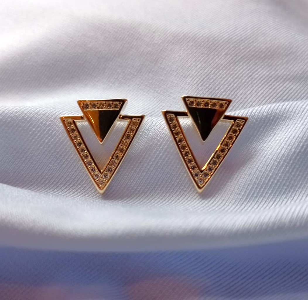 Par de brincos, fixo na orelha, cravejado com zircônia e formato de triângulo, banhado a ouro 18k, com banho antialérgico e garantia de 6 meses que cobre excluisivamente o desgaste natural da folheação.